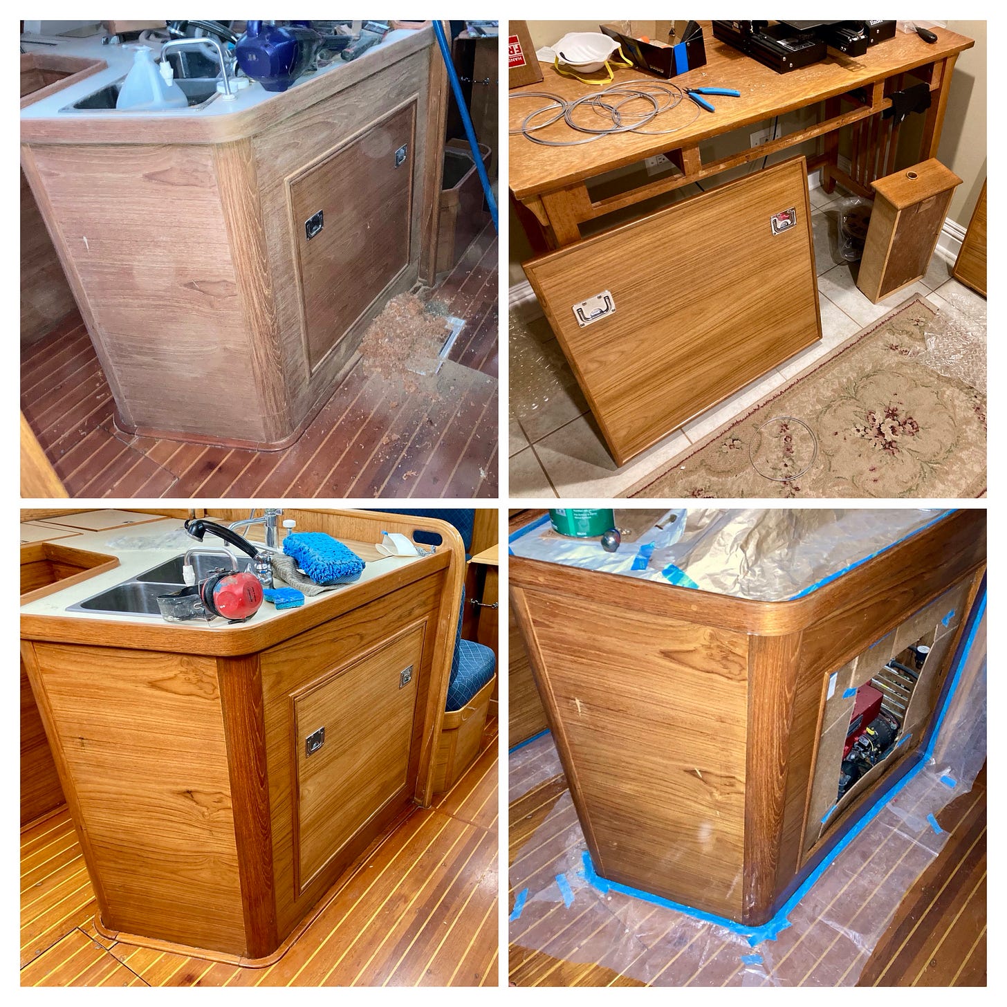Both of the aforementioned projects were the result of three decades of Nature’s touch. Below decks, the finish on the cabinetry had developed a mottled blotchiness more akin to chicken pox than freckles. In other words, not pretty. Many hours of careful work with a sharp scraper, followed by the mindless chore of hand sanding, and the woodwork was relieved of whatever varnish had originally been applied at the factory. Reapplying the new poly was comparatively fast and easy, considering I had an ace up my sleeve - a paint sprayer.