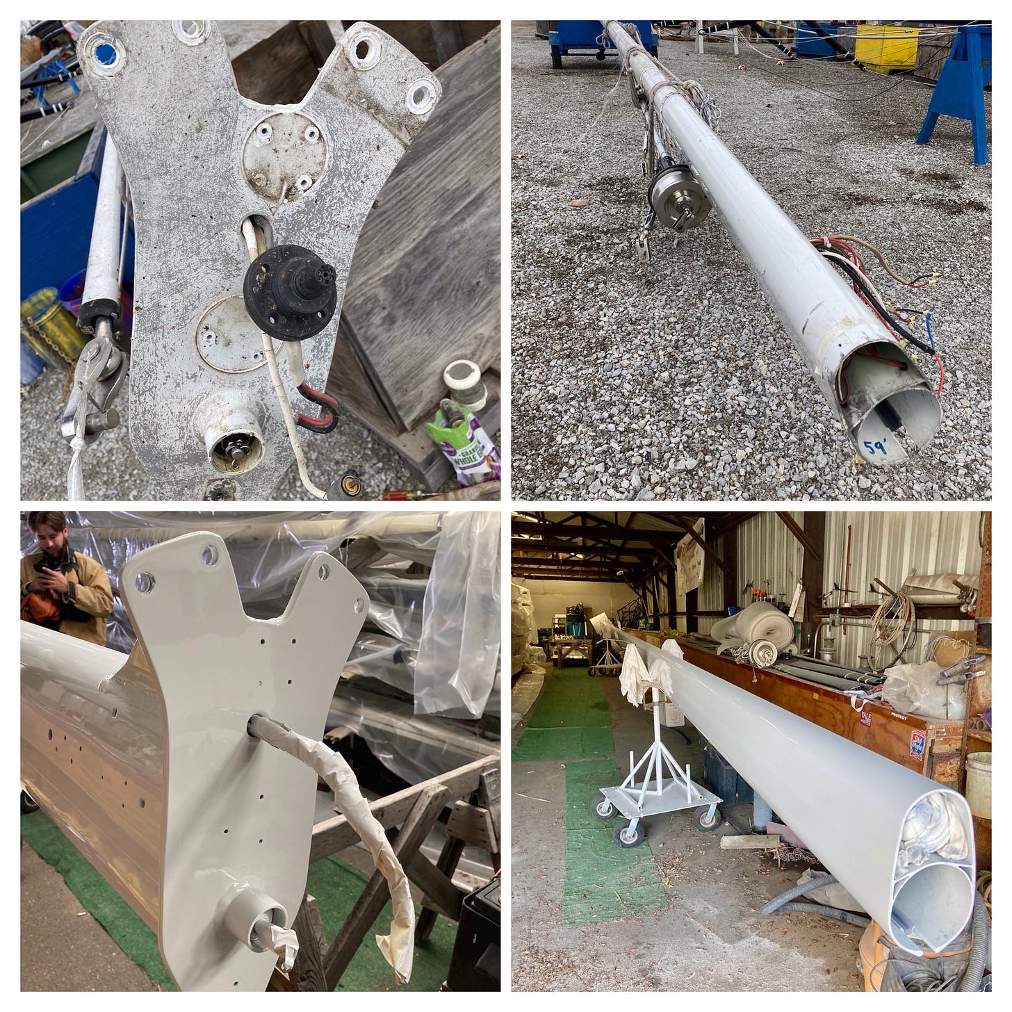 Meanwhile above deck, the previously brilliant white paint on the mast had degraded to a chalky gray, completely worn off in spots. However, you can’t just chuck a 59 foot long aluminum extrusion into the paint booth without removing every last bit of hardware from the big stick. Several wintry visits to the boatyard later, I could finally release the mast to the painters. Only one small aluminum cleat refused to give up its attachment to the spar. Careful surgery with my angle grinder took care of the recalcitrant piece.